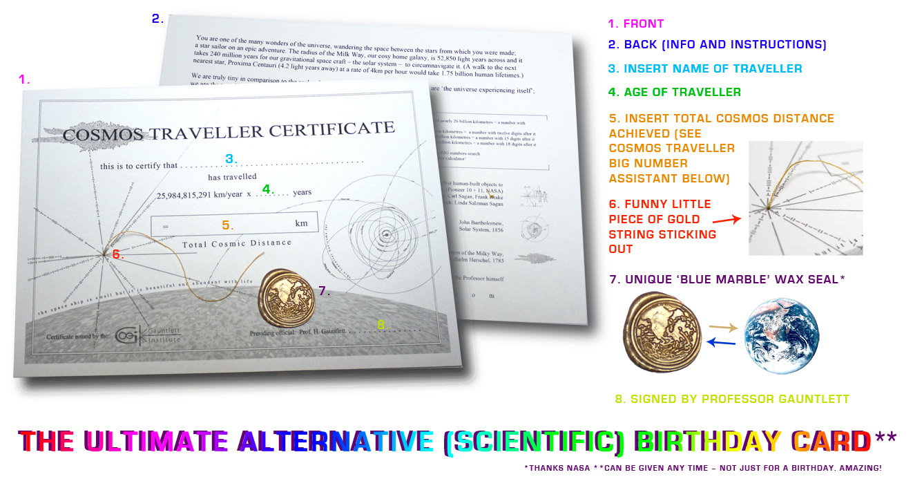 It's real! Like never before, your staggering journey through the cosmos can be revealed and given the official Gauntlett Institute seal of genuine distance.You've come a long way, truly, and now you have scientific evidence from the Gauntlett Institute to validate it.Buy your Cosmos Traveller Certificates as gifts and amaze all your family and friends and friends of friends and acquaintances on their birthdays*.